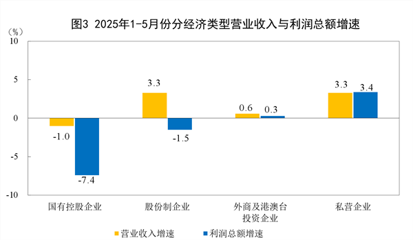 1—5月份,规模以上工业企业中,国有控股企业实现利润总额8709.5亿元,同比下降7.4%;股份制企业实现利润总额20170.7亿元,下降1.5%;外商及港澳台投资企业实现利润总额6856.8亿元,增长0.3%;私营企业实现利润总额7592.5亿元,增长3.4%。