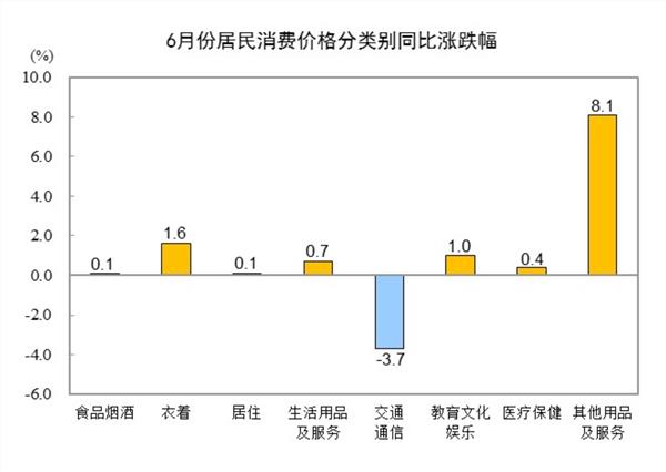 其他七大类价格同比六涨一降。其中,其他用品及服务、衣着、教育文化娱乐价格分别上涨8.1%、1.6%和1.0%,生活用品及服务、医疗保健、居住价格分别上涨0.7%、0.4%和0.1%;交通通信价格下降3.7%。