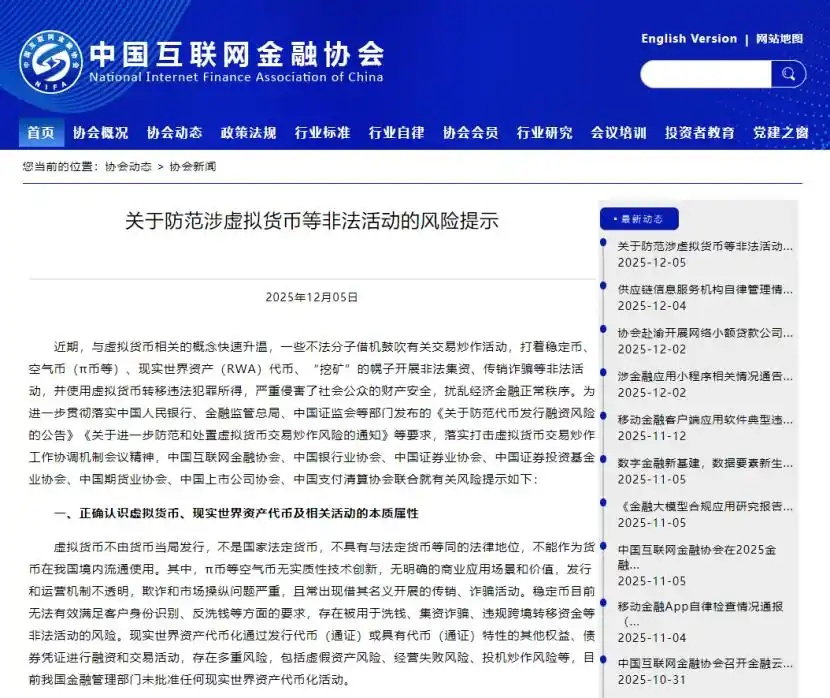 《提示》明确指出,虚拟货币非国家法定货币,境内流通不受法律保护。一些不法分子借机鼓吹有关交易炒作活动,打着稳定币、空气币(π币等)、现实世界资产(RWA)代币、“挖矿”的幌子开展非法集资、传销诈骗等非法活动,并使用虚拟货币转移违法犯罪所得,严重侵害社会公众的财产安全,扰乱经济金融正常秩序。