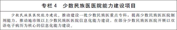 3.发展少数民族医药。加强少数民族医医疗机构建设,提高民族地区基层医疗卫生机构少数民族医药服务能力。改善少数民族医医院基础设施条件,加强少数民族医医院专科能力、制剂能力和信息化能力建设。建立符合少数民族医医疗机构自身特点和发展规律的绩效评价指标体系。加大少数民族医药防治重大疾病和优势病种研究力度,有效传承特色诊疗技术和方法。鼓励和扶持少数民族医药院校教育、师承教育和继续教育。加大对少数民族医药的传承保护力度,持续开展少数民族医药文献抢救整理工作,推动理论创新和技术创新。