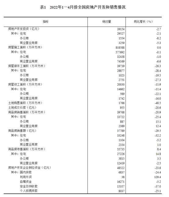 国家统计局数据显示,1—4月份,商品房销售面积39768万平方米,同比下降20.9%;其中,住宅销售面积下降25.4%。商品房销售额37789亿元,下降29.5%;其中,住宅销售额下降32.2%。