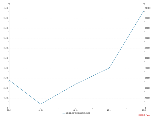 今年以来,受到俄乌局势影响,氮肥、钾肥价格均出现大幅上涨,这也带动了磷肥及其原料价格。海关数据显示,今年以来国内磷矿石出口量逐步增加,2月份出口总量达4020吨,到了5月份,这一数据已经接近10万吨。