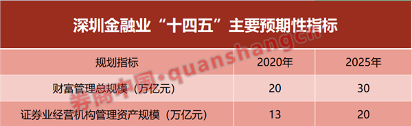 根据2022年1月发布的深圳市金融业高质量发展“十四五”规划,2020年深圳财富管理总规模仅20万亿元,其中证券业经营机构管理资产规模仅13万亿元。而预计到2025年,这组数字将增长至30万亿元、20万亿元。