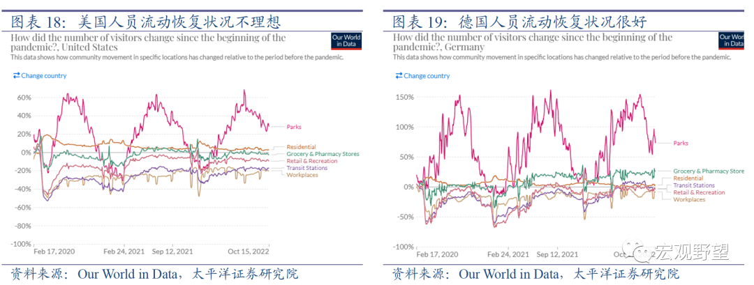 最后我们观察新兴市场和发展中国家的经验,新兴经济体的人员流动恢复的状况普遍非常好。有趣的是,大部分新兴市场国家的人员流动状况不仅恢复到了疫情前的水平,甚至还远超过疫情前的水平。这一情况并非少数国家的特例,而是众多新兴经济体的共性,也就意味着背后有着深层的经济或社会规律。人员流动状况恢复至疫情前的水平容易理解,但为什么会远超过疫情前的水平呢?我们认为这可能与相关国家外出工作的人数增多有关。疫情期间低收入群体的财务状况受到的冲击更大,这部分人群在疫情防控政策放开后有更强的动力外出工作来获取收入,所以人员流动率随之上升,而发展中国家的低收入群体远远多于发达国家,故而宏观上表现为发展中国家整体人员流动率恢复情况非常好。