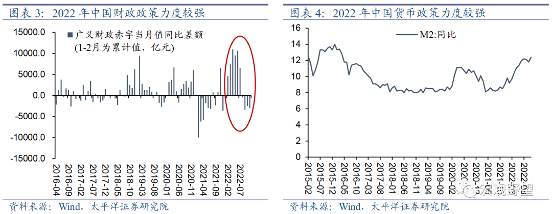 不过,虽然面临着海外的制约,2022年中国在“稳增长”的主基调下,政策宽松的力度整体上仍是比较强的。财政政策方面,2022年广义财政赤字同比差额远远高于过去几年的水平,甚至远高于2020年第一波疫情期间的力度。货币政策方面,自2016年“供给侧改革”以来,中国政策总体上重视供给侧调整而淡化需求侧刺激,所以货币供给增速出现了系统性的下降,但2022年中国货币供给M2增速达到了2016年以来的最高值,也就是说货币政策实际上力度也是比较强的。