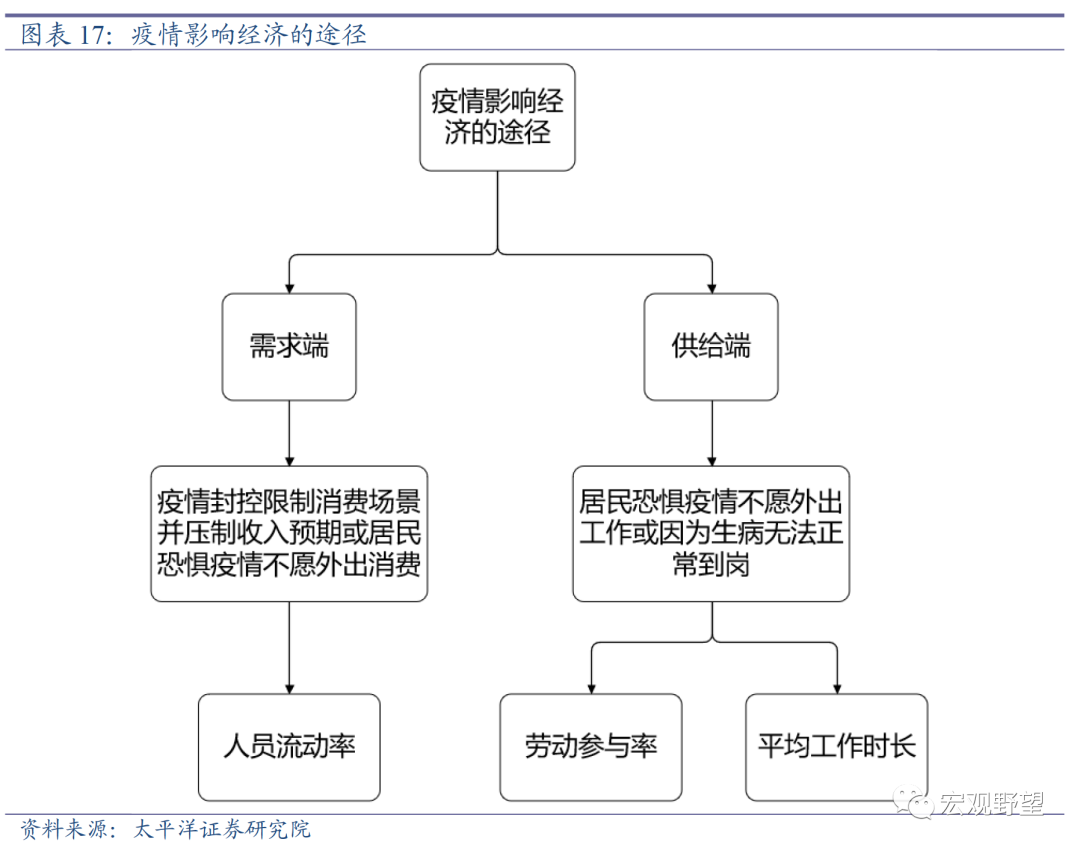 我们认为直接观察海外各国的生产、消费等经济数据并不能很好推断疫情的长期影响。当前全球经济正处于下行周期之中,这主要是由于近两年来各国纷纷退出了宽松的宏观政策,并且迅速转向收紧。美联储为代表的各国央行开启了几十年来最强力的加息周期。在这样的背景下,全球经济无论是否受到疫情的“疤痕效应”的影响,各项经济数据必然表现不佳。所以我们认为,简单地从其它国家生产、消费等经济数据表现的优劣并不能推断出疫情的长期影响如何。若要衡量疫情对经济的长期影响,应当寻找既能反映疫情影响、同时又能基本独立于经济周期的指标。我们从疫情对经济的影响途径来分析这一问题。疫情对经济的需求端及供给端两方面都有相应的冲击。在需求角度,我们认为疫情主要有两个影响渠道,一是防疫政策带来的封城使得相关消费场景消失,同时防疫政策的不确定性也导致居民收入预期不稳,消费意愿下降。二是疫情带来的恐惧情绪阻碍了居民外出消费的意愿。在疫情防控政策完全放开之后,实际上第一个渠道已经不存在,所以疫情对于需求端的负面影响主要体现在对居民出行意愿的影响。基于这一逻辑链条,我们可以通过观察人员流动率来衡量疫情对各国需求端的影响。在供给角度,我们认为疫情也主要有两个影响渠道,一是疫情蔓延带来的恐惧情绪可能导致居民不愿外出工作,退出劳动力市场。二是正在就业的工人也可能因为染病而无法正常到岗,影响实际劳动力供给。对于第一个渠道,我们可以通过观察劳动参与率的指标来衡量其影响;对于第二个渠道我们可以观察工人平均工作时长或出勤天数的数据来分析。最终我们选择了人员流动率、劳动参与率和平均工作时长三个指标来衡量防控政策放开后疫情对各国经济的影响。一方面,从上文的分析来看这三个指标可以比较精准地刻画出疫情的影响;另一方面,这三个指标基本不受到经济周期本身的影响,短期内几乎只受到疫情的干扰。我们认为对于分析疫情的长期影响有较强的参考价值。
