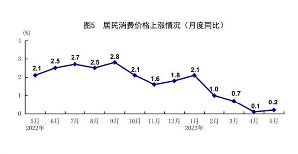 5月份,全国居民消费价格(CPI)同比上涨0.2%,环比下降0.2%。分类别看,食品烟酒价格同比上涨1.2%,衣着价格上涨0.9%,居住价格下降0.2%,生活用品及服务价格下降0.1%,交通通信价格下降3.9%,教育文化娱乐价格上涨1.7%,医疗保健价格上涨1.1%,其他用品及服务价格上涨3.1%。在食品烟酒价格中,猪肉价格下降3.2%,鲜菜价格下降1.7%,粮食价格上涨0.5%,鲜果价格上涨3.4%。扣除食品和能源价格后的核心CPI同比上涨0.6%。1-5月份,全国居民消费价格同比上涨0.8%。