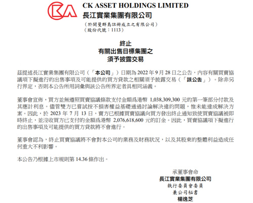 时隔一年,长实集团旗下的顶级豪宅项目交易生变。7月13日,长实集团公告称,终止出售香港波老道21号的物业发展项目,并没收买方约20.77亿港元的订金。7月13日,长实集团发布的公告显示,终止出售位于香港波老道21号的物业发展项目“21 BORRETT ROAD”,并没收买方约20.77亿港元的订金。长实集团表示,因买方并无遵照买卖协议条款支付10.38亿港元的第一笔部分付款及其应计利息。尽管双方已尝试按不损害权益基础通过讨论解决违约问题,但未能达成解决方案。因此,于7月13日,卖方已根据买卖协议向买方发出终止通知,致使买卖协议被即时终止,并没收买方已支付的金额为港币20.77亿港元的订金。因此,买卖协议项下拟进行的出售事项及可能提供的买方贷款将不会进行。长实集团董事会认为,终止买卖协议将不会对本公司的业务及财务状况,以及其股东的整体利益造成任何重大不利影响。去年9月28日,长实集团宣布,将位于中半山波老道21号的发展项目“21 BORRETT ROAD”出售给新加坡公司LC Vision Capital,并由华瑞资本管理。该项目包括152个住宅单位、242个住宅停车位及31个电单车停车位,总代价约207.66亿港元。据悉,香港半山区是香港乃至亚洲都大名鼎鼎的“富豪之地”,位于中半山波老道21号项目更是其中翘楚,被称为香港半山的顶级豪宅,可饱览中环及维多利亚港。根据长实集团此前的公告,买方已于买卖协议当日支付约20.77亿港元(占总代价的10%)的定金。此后,买方须于买卖协议日期后每6个月向卖方支付共5笔部分款项(共占总代价的40%),其中前两笔部分付款每笔须为约10.38亿港元,后三笔部分付款每笔须为约20.77亿港元。最后于交易完成时支付余额。长实集团还预计,该出售事项获得的收益约63亿港元,出售事项所得款项净额将用于集团一般营运资金用途。彼时有消息人士表示,这次交易对买卖双方均属公平有利,并缔造双赢局面,而物业发展与销售一向是长实的核心业务,而且长实日常以「货如轮转」的策略营运,相信这次长实向单一买家全数出售波老道尚待推出之单位,能有效率地锁定可观利润。但现如今,该项目交易生变,买方约20.77亿港元的订金或打水漂。据时代财经,7月13日晚间,长实集团执行董事赵国雄对外表示,21 BORRETT ROAD豪宅项目位于香港最尊贵的山顶地段,乃一项稀珍的优质资产。在签订合约后,由于市场不断变化及利率变动,尽管双方已尝试在不损害权益的基础上讨论,研究不同方案解决问题,但未能达成协议。近来,李嘉诚动作频频,欲出手抄底内地房企项目。据市场消息,李嘉诚旗下长实集团已与汇丰接触,希望接手合景泰富与龙光合伙开发的香港“凯玥”项目相应债权,该笔债权是由汇丰、渣打等银团所持有的约102亿抵押贷款。据观点网,有接近龙光人士回应称上述消息属实,同时表示,“凯明”的债权在两家公司计划重组的范畴之内,如果此刻该债权被银团转让给长实集团,担心长实会反对债务重组,逼迫项目走上拍卖转让之路,最终导致项目易主。“凯玥”为海景房项目,位于香港仔及鸭脷洲利南道66号,位置优越,背山靠海,属于名副其实的海景房,且为香港典型的豪宅项目。此前,“凯玥”项目在2023年1月首次对外出售,推售的住宅共295套,主要为三房、四房户型。按照该项目67.3万平方英尺的总销售面积,5万港元/平方英尺的单价计算,该项目的估值折合人民币约307亿元。目前,龙光和合景泰富都面临债务危机,正处于债务重组的重要时刻。长实集团的介入无疑让人浮想联翩。业内人士称,若长实集团取得项目控制权,可能会导致合景泰富正在着手推进的境外债务重组工作面临阻碍与风险,带来诸多不确定因素。在股价表现方面,长实集团股价年内震荡走低,截至目前,该股总市值为1575亿港元。