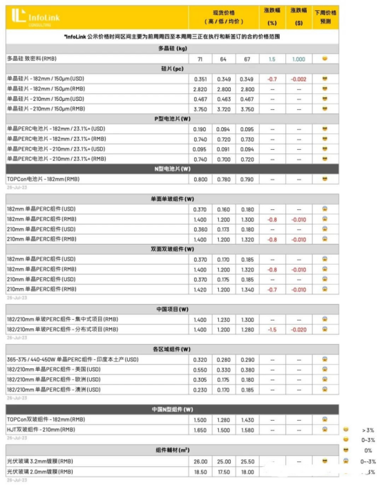 目前看组件涨价仍未成功,受制终端需求拉动影响,当前需求并无明显提升。展望8月,部分分销价格仍持续酝酿1-2分人民币的涨幅,然而后续是否落定目前仍旧需要端看需求启动的情况,厂家竞争订单、远期价格仍有让价,涨价成功落地机率有限。8月新单报价预期已来到1.2-1.28元人民币左右的水平,部分签单甚至有低于1.2元的价位。