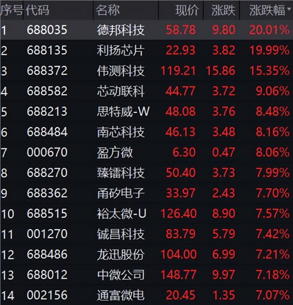 个股方面,德邦科技、利扬芯片开盘不久后即拉出20CM涨停,伟测科技涨超10%。中微公司涨超7%,中芯国际涨近7%,寒武纪、华虹公司、北方华创等龙头股均有明显涨幅。