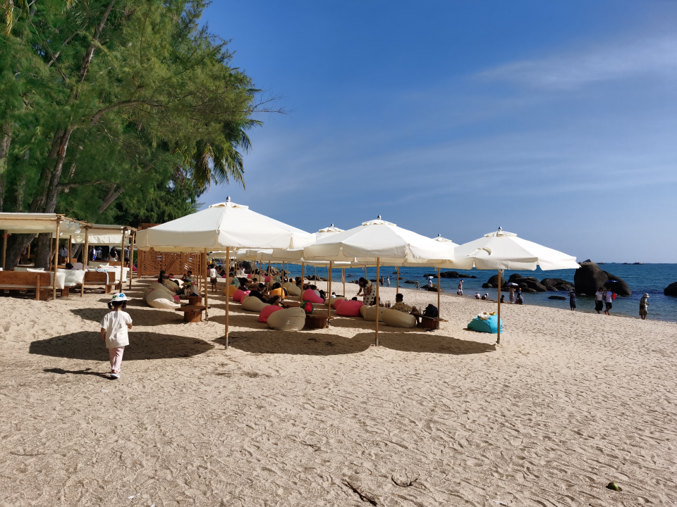 后面我们又乘坐观光车回到了西岛中心广场,有美食街、白沙滩、椰林海岸等,可以吃一碗海鲜面,坐在海边椰树下感受海风、挖沙子,或者走到海边泡在海水里,感受海浪拍打着岸边,还可以看到有人在玩海上拖伞、帆船、水上飞龙、快艇、香蕉船等项目。基金君看到岛上快到中午时也是热闹非凡。