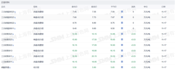 证券之星新能源车行业周报:据上海有色网,截止11月17日,电池级碳酸锂14.05-15.35万元/吨,均价14.7万元/吨,环比上一工作日下滑0.05万元/吨;工业级碳酸锂13.55-14.3万元/吨,均价13.93万元/吨,环比上一工作日下滑0.07万元/吨。近期上游盐厂依然挺价出售散单,但整体成交寥寥,现货成交价格延续下行趋势。此外,近期部分正极端企业出售碳酸锂原料库存,叠加近期锂盐集中到港,均使锂盐供应端增量明显,市场短期以降低库存为主。