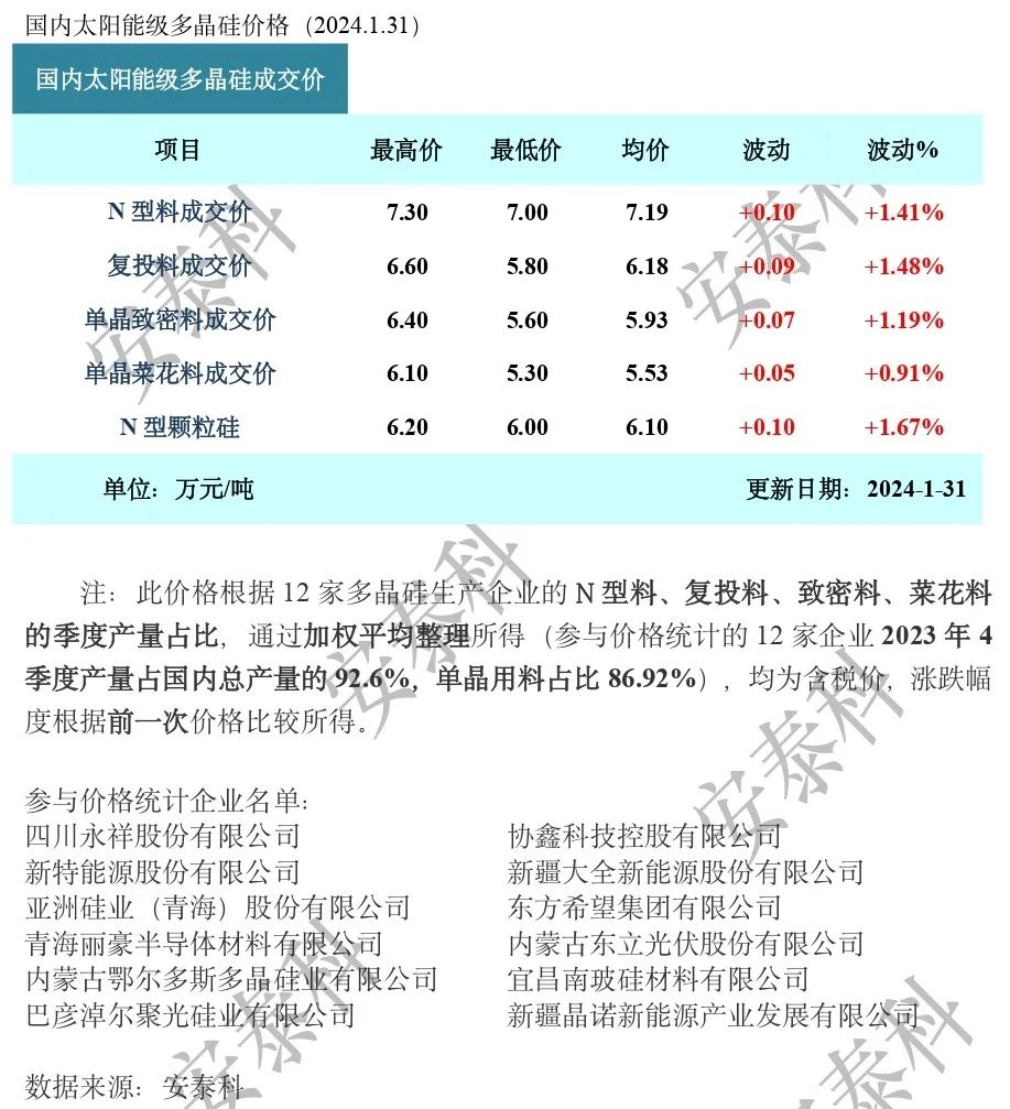 临近春节假期,下游拉晶企业局部下调开工,整体看开工率基本维持稳定。预计在本周内下游基本完成年前备货,之后的市场成交将相对有限,基本不会形成新价格。而年后3月份多晶硅即将有新产能投放,具体市场价格将极大程度的取决于下游开工变化和新增产能释放进度。