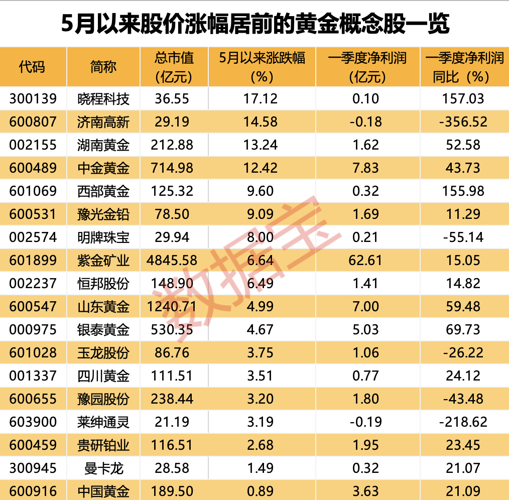 据证券时报·数据宝统计,5月以来,黄金概念股股价表现维持强势,概念股股价平均上涨5%,跑赢大盘。晓程科技、济南高新、湖南黄金、中金黄金均上涨超10%。